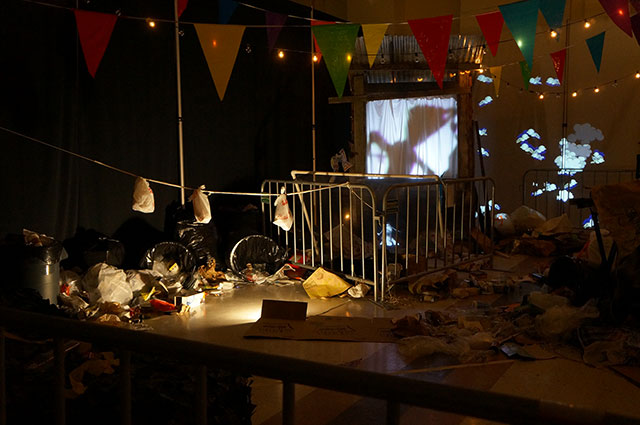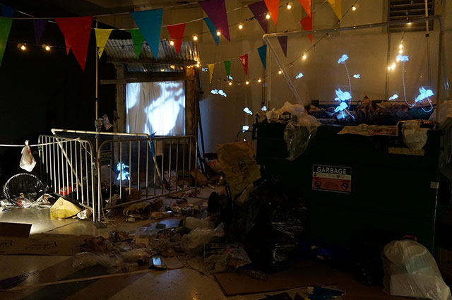 For Bumbershoot 2016, Seattle based artist Brent Watanabe creates a large scale multi-media installation titled 'operand'. 'operand' is the abstracted remains of a parking lot carnival and the creatures abandoned in its wake. An automated carny moves about frantically in his shack, pulling levers and flipping switches, while a ghostly watchdog diligently stands guard. A handful of holographic birds tug and struggle to escape a dumpster overflowing with trash, as flocks of birds hover and circle in the distance beneath carnival lights and pennants. Creatures trapped in plastic take out bags twitch and shiver in drifts of garbage and detritus.